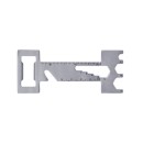 Abridor de garrafas metálico multiferramentas, possui réguas com unidades em centímetros e polegadas, 5 chaves de boca, 3 chaves hexagonais e faca de cordão.