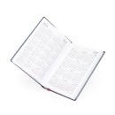 Agenda diária 2025 de couro sintético. Contém fita de cetim marca página, dados pessoais, calendário de 2024 à 2026, mapa do Brasil, mapa-múndi, índice telefônico e planejamento.