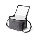 Bolsa térmica em tecido feltro com capacidade para 5 litros, possui revestimento térmico, bolso frontal e alças para as mãos.