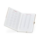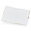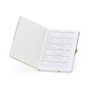 Caderneta de cortiça com detalhe em linho e suporte para caneta, contém marcador de página em cetim, página para dados pessoais, calendário 2023 a 2025, páginas de planejamento e aproximadamente 93 folhas marfim com pauta.
