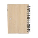 Caderneta ecológica com caneta. Capa de bambu. Possui aproximadamente 50 folhas brancas pautadas. Acompanha uma caneta de bambu com detalhes em metal.