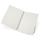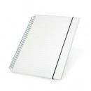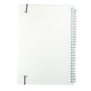 Caderno B5 com capa plástica e elástico para lacre, contém aproximadamente 80 folhas marfim com pauta.