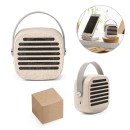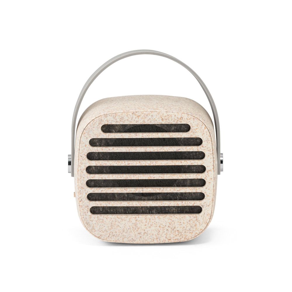 Caixa de som portátil em fibra de palha de trigo e ABS com alça em silicone para facilitar o transporte, potência de 3W e transmissão por bluetooth 5.0. Tempo de reprodução de 4h30, com uma bateria de 500 mAh. Incluso cabo micro USB. Fornecido em caixa presente de papel craft