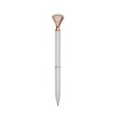 Descrição: Caneta metálica com carga esferográfica azul e acionamento por rotação.