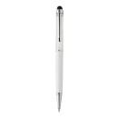 Caneta plástica com touch screen e detalhes em cristal, acionamento por rotação e carga esferográfica azul 1mm.