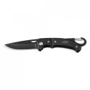 Canivete em aço inox e metal com fecho de segurança e mosquetão. Fornecido em caixa presente.