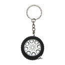 Chaveiro trena 1 metro formato pneu brilhante, material emborrachado com relevo. Detalhes do aro em plástico prata, verso liso. Trena não possui trava.