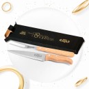 Conjunto de Faca em Madeira/Aço Inox; Acompanha faca 7”, garfo em Madeira/Inox e caixa para presente. Como cortesia, fazemos uma gravação na lâmina da faca com os cortes do boi.