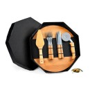 Conjunto para pizza em Bambu/Inox. Acompanha tábua e espátula em bambu; quatro facas de mesa, quatro garfos de mesa e cortador de pizza em Bambu/Inox. Embalagem ideal para presentear.