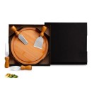Kit para queijo. Conta com tábua redonda em bambu; duas facas, uma espátula e um garfo em inox/madeira para queijos. Tábua confeccionada com tripla camada invertida, para dar maior durabilidade e não deformar com o passar do tempo