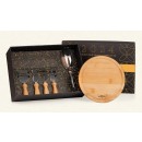 Conta com tábua em Bambu; Duas facas, uma espátula e um garfo para Queijo; Taça em vidro.