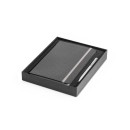 Conjunto esferográfica e caderno A5. A esferográfica é em alumínio com clipe de ferro e é de mecanismo twist com escrita a azul. O caderno A5 tem capa rígida, fita separadora, elástico, bolso interior e 80 folhas pautadas de cor marfim. Conjunto fornecido em caixa de oferta. Esferográfica: ø10 x 138 mm | Caderno: 137 x 210 mm | Caixa: 190 x 240 x 30 mm