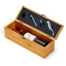 Acessórios para vinho em Metal com estojo em Bambu. Conta com espaço para a garrafa, tampão, termômetro, anel corta-gotas e abridor saca-rolhas. (NÃO ACOMPANHA GARRAFA)