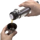 Garrafa térmica 350ml em inox com tampa rosqueável, tampa interna em plástico resistente(basta um clique para abrir ou fechar). Acompanha capa protetora de couro sintético com alça de nylon.
