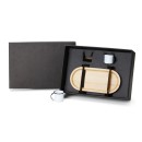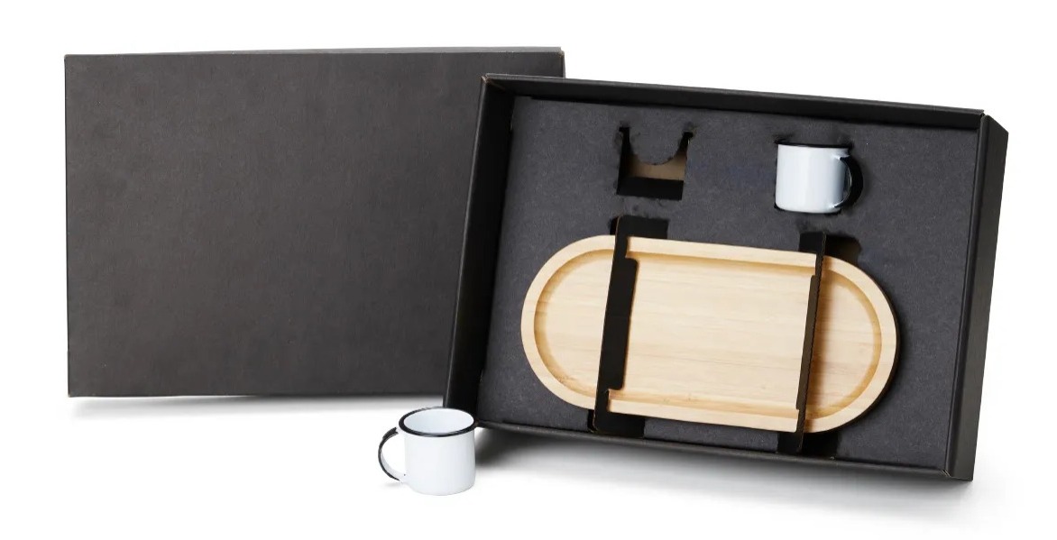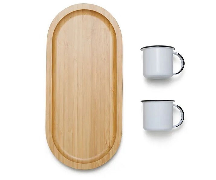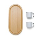 Conta com bandeja em bambu para servir com formato oval e duas canecas em alumínio esmaltado branco