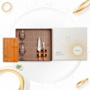 Conjunto composto por uma tábua retangular em bambu com sulco; Faca 7” e um garfo trinchante, ambos com cabo em bambu e lâmina em aço inox com rebites resistentes; duas taças para cerveja.