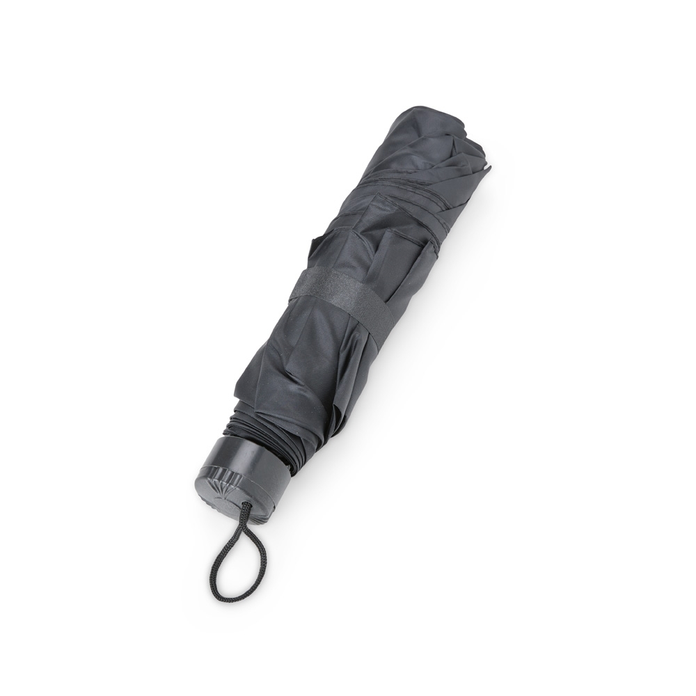 - Guarda-chuva de nylon reforçado: Possui estrutura com 7 varetas de aço, garantindo maior resistência e durabilidade. Conta com botão de abertura automática, alça para transporte e capa protetora.