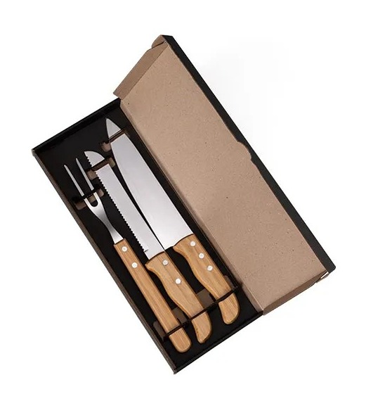 Conjunto de Faca em Bambu/Aço Inox com facas de 7″ e 8”, garfo em Bambu/Inox. Como cortesia, na faca 8″ fazemos uma gravação com os cortes do boi.
