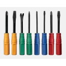 Kit composto por oito ferramentas em aço, sendo três chaves de fendas, quatro chaves philips e um extrator de pregos, todas com cabos em polipropileno, acomodados em um estojo com base preta e tampa em acrílico. Possui ainda um cabo para fixação das chaves e soquete em polipropileno adaptável para porcas borboletas.
