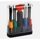 Kit composto por oito ferramentas em aço, sendo três chaves de fendas, quatro chaves philips e um extrator de pregos, todas com cabos em polipropileno, acomodados em um estojo com base preta e tampa em acrílico. Possui ainda um cabo para fixação das chaves e soquete em polipropileno adaptável para porcas borboletas.