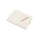 Este kit contém uma Caderneta A5 em linho com detalhe em cortiça e suporte para caneta, marcador de página em cetim, aproximadamente 82 folhas com pauta e caneta de cortiça com detalhes em palha de trigo, carga esferográfica azul 1.0mm e acionamento por clique.