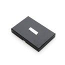 Kit executivo 3 peças em estojo de papelão com tampa e parte interna revestida de espuma. Contém: chaveiro metal fosco com detalhe emborrachado preto, porta cartão de couro sintético(verso metálico liso) com placa de metal e caneta metal fosca com detalhe emborrachado preto. Acompanha placa metálica para gravação.