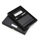 Kit executivo 3 peças em estojo de papelão com tampa e parte interna revestida de espuma. Contém: porta cartão de couro sintético texturizado com detalhes prata brilhante, caneta metal fosca com detalhe emborrachado preto, caderneta em couro sintético com aproximadamente 80 folhas amarelas pautadas. Acompanha placa metálica para gravação.