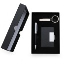 Kit executivo 3 peças em estojo de papelão com tampa e parte interna revestida de espuma. Contém: chaveiro metal fosco com detalhe emborrachado preto, porta cartão de couro sintético(verso metálico liso) com placa de metal e caneta metal fosca com detalhe emborrachado preto. Acompanha placa metálica para gravação.
