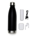 Conta com fone de ouvido bluetooth com comandos touch, microfone, carregador de fechamento magnético e acompanha USB Lightning para carrega; Garrafa em aço Inox preta com tampa rosqueável com capacidade total de 750ml e garregador portátil USB em Plástico ABS para celular/smartphone/tablet.