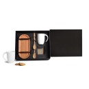Kit para café/chá. Composto por bandeja oval e duas colheres de 18 cm em bambu; duas canecas em cerâmica branca com 350 ml cada uma.