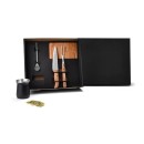 Kit para churrasco. Conta com tábua em Bambu; Faca 7″ e garfo em aço Inox/Madeira; cuia em Aço Inox; bomba para chimarrão / tereré. Tábua confeccionada com tripla camada invertida, para dar maior durabilidade e não deformar com o passar do tempo. Como cortesia, na faca 7″ fazemos uma gravação com os cortes do boi. Cuia confeccionada com dupla parede de inox 300ml. Conta com dupla parede de inox, isoladas a vácuo.