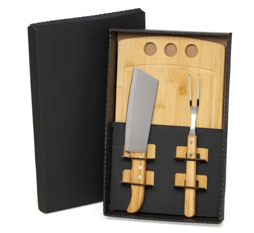 Conta com tábua em Bambu; cutelo e garfo em Bambu/Inox.