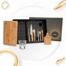 Kit para Churrasco e Caipirinha. Composto por tábua para Churrasco, tábua para Caipirinha, socador, colher de 18cm e pegador em Bambu; faca 4″ para frutas e garfo em Bambu/Inox; faca 8″ em Madeira/Inox; composto também por copo em vidro. Estão perfeitamente acomodados em uma caixa para presentear. Como cortesia, na faca 8″ fazemos uma gravação com os cortes do boi.