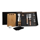 Kit para churrasco/hambúrguer. Conta com tábua em Bambu com três furos; Faca 8” e garfo em Bambu/Inox; pegador e espátula perfurado em aço Inox/Madeira; Avental em Brim preto; dois ramekins; duas taças para cerveja.
