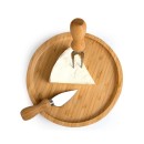 Kit para petisco / queijo. Conta com petisqueira espátula em bambu; faca e garfo para queijo.
