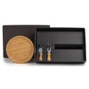 Kit para petisco / queijo. Conta com petisqueira espátula em bambu; faca e garfo para queijo.