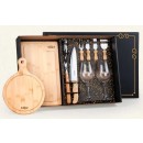 Conta com tábua para Churrasco e tábua para frios em Bambu; Duas facas, uma espátula e um garfo para Queijo; Faca 8″ e garfo em Bambu/Inox; Abridor de Vinho em Inox; 2 taças em vidro.