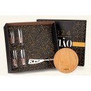 Kit para queijo e cerveja; Conta com tábua redonda para queijo/petiscos; Faca para frios em metal; Quatro copos para cerveja em vidro. Estão perfeitamente acomodados em uma caixa para presentear.