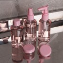 Kit viagem 6 peças em estojo ziplock. Contém frasco de 80ml com tampa spray; frasco de 80ml com tampa rosqueável; frasco de 80 ml com tampa pump; 2 potes de 10ml com tampa rosqueável e mini espátula fosca. Frascos plásticos e estojo em pvc com puxador plástico.