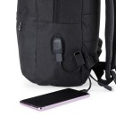Mochila de nylon 24 litros com três compartimentos, sendo o principal com bolso para notebook 14 polegadas. A mochila possui um bolso lateral e suporte externo usb.