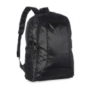 Descrição: Mochila de nylon 42 litros com dois compartimentos e bolsos laterais em malha. Possui fivelas laterais para regulagem de tamanho e duas alças de mãos, sendo uma delas reforçada com pegador plástico.