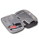 Descrição: Mochila confeccionada em poliéster com compartimento para notebook até 17 polegadas. Contém Dois compartimentos grandes sendo um com divisórias para documentos, eletrônicos e caneta, e um com divisória para Notebook até 17 polegadas. Compartimento frontal com abertura vertical. Tecido Impermeável. Alça traseira para conter as alças de ombro. Adaptador USB externo com cabo acoplado, permitindo a conexão de um carregador portátil de dentro da mochila e transferência da carga para o lado externo, ocultando o carregador e viabilizando a utilização do celular durante o processo. Contém zíperes com pegadores metálicos, alça de mão em nylon, alças para as costas ajustáveis com revestimento espumado antitranspirante e alça lateral que possibilita que a mochila seja carregada como uma pasta