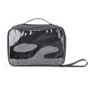 Nécessaire confeccionada em nylon, com frente em visor transparente, fechamento por zíper e alça superior. Inclui também uma alça de transporte em nylon.