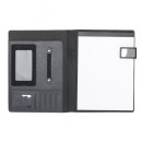 Pasta convenção de couro sintético com trava de imã lateral, possui uma placa de metal na trava ideal para personalização. Possui “bolso” para arquivar documentos, porta celular com visor fosco, porta cartões com divisórias e visor além de um bolso atrás, suporte elástico para caneta(não acompanha) e bloco A4 com aproximadamente 20 folhas brancas pautadas de verso liso.