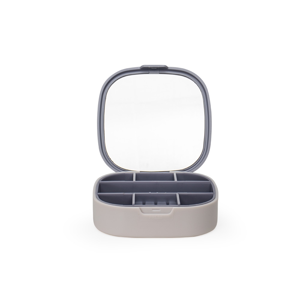 Nosso Porta-jóias organiza seus acessórios de forma prática e compacta. Produzido em plástico, é a escolha ideal para manter anéis, brincos, batom e pulseiras sempre acessíveis. Com 7 compartimentos estratégicos para guardar tudo, feitos em material macio e emborrachado, removíveis para facilitar a limpeza, ele também conta com um espelho na tampa, facilitando na hora de montar looks com as jóias. Perfeito para quem valoriza organização, autocuidado e praticidade no dia a dia.